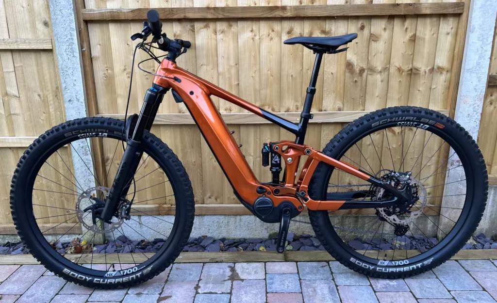 The Giant Trance X E 1 PRO is an electric mountain bike designed for off-road adventures. It features a full suspension frame with 150mm of travel, paired with a Fox Float DPS Performance shock and Fox 36 Performance Elite fork for a smooth and controlled ride over rough terrain.